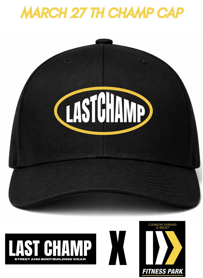 La casquette a été conçue comme une pièce représentative de l’identité de LAST CHAMP, en lien avec l’environnement fitness et l’image véhiculée lors de la soirée. Elle a été pensée pour être portée par les acteurs présents sur place, notamment les responsables et membres de l’encadrement, afin d’assurer une visibilité naturelle et cohérente.